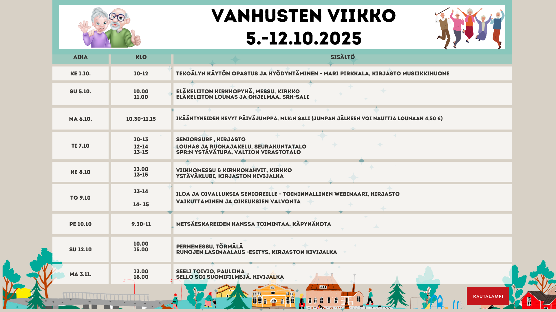 Vanhustenviikon tapahtumista tiedotetaan tapahtumakalenterissa, Sisä-Savo-lehdessä, julistein, info-tv:ssä ja tulostettavin lehdyköin. Selvitetään Viikkolehden ja Rautalampi-lehden ilmestymisajankohtien sopivuus Vanhustenviikon tapahtumien tiedottamiseen.